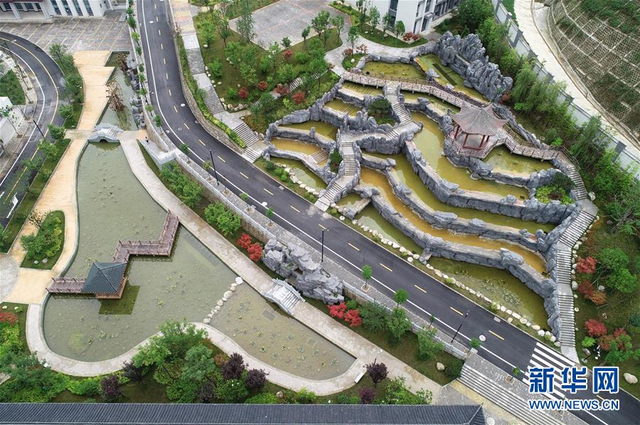 鎮(zhèn)安縣鎮(zhèn)安中學(xué)多級(jí)瀑布群與水池棧道涼亭景觀(7月30日攝,無人機(jī)照片)。新華社記者邵瑞攝
