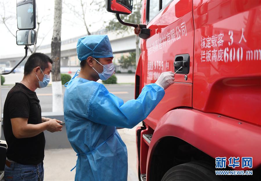 工作人員在新發(fā)地批發(fā)市場周轉新區(qū)對進場車輛進行取樣(8月6日攝)。 新華社記者 張晨霖 攝