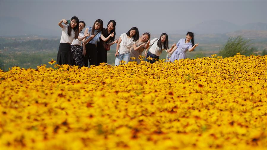 6月27日,河北內(nèi)丘縣扁鵲藥谷中藥材種植基地工人在對(duì)黑心金光菊進(jìn)行管護(hù)。