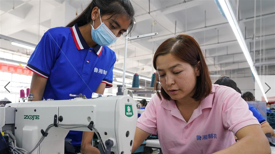 6月11日,在新疆喀什市一家服裝企業(yè)生產(chǎn)車(chē)間里,組長(zhǎng)艾尼皮古麗·玉麥爾(右)在指導(dǎo)工人縫制布料。