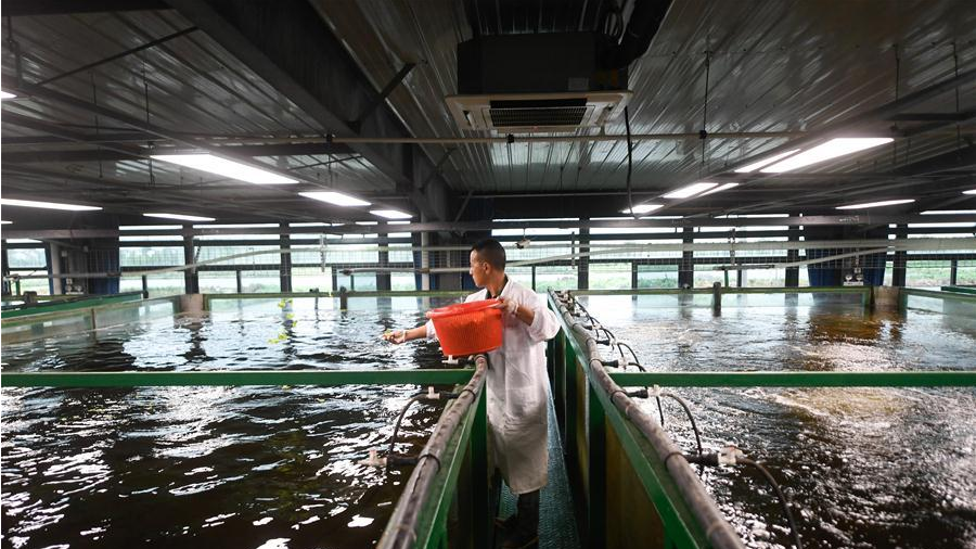 6月18日,技術(shù)人員在智能化循環(huán)水養(yǎng)殖車(chē)間進(jìn)行管理。