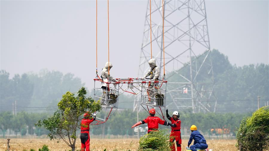 6月18日,直升機(jī)用吊籃把兩名檢修人員“吊”到有缺陷的特高壓線(xiàn)路上。