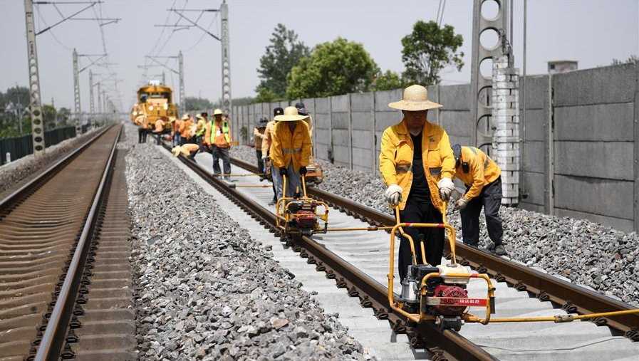 6月3日,施工人員在京九鐵路線上進行更換水泥枕施工。