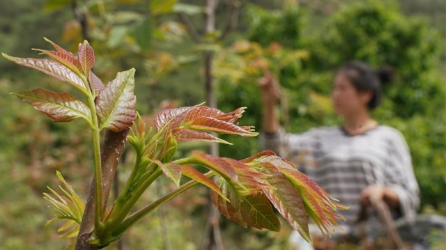 5月17日,秦皇島市撫寧區(qū)王家灣村的一位村民在自家香椿園采摘香椿芽。