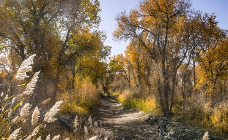 10月中下旬,靜靜的塔里木河中下游一片金黃。胡楊深處,條條小路蜿蜒綿長通向遠(yuǎn)方,引人入勝。