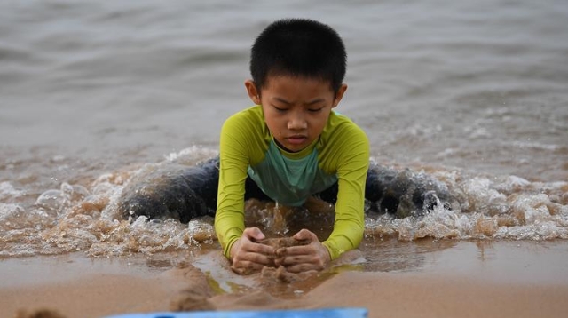 近日,海口持續(xù)高溫,不少市民前往海灘戲水消暑。