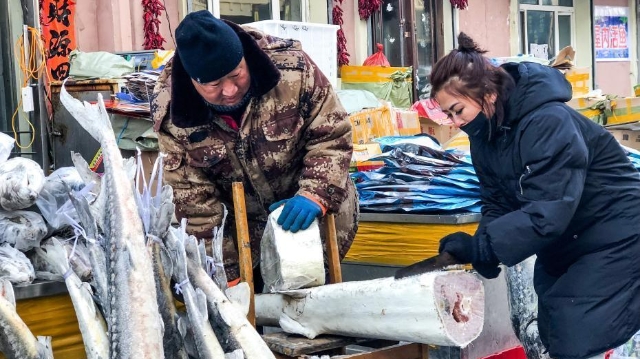 寒冬臘月是黑龍江撫遠(yuǎn)的凍魚銷售旺季。讓人大開眼界的是,一二百斤大魚得鋸開了賣;最讓魚販子開心的是,最多一天進(jìn)賬5萬元。