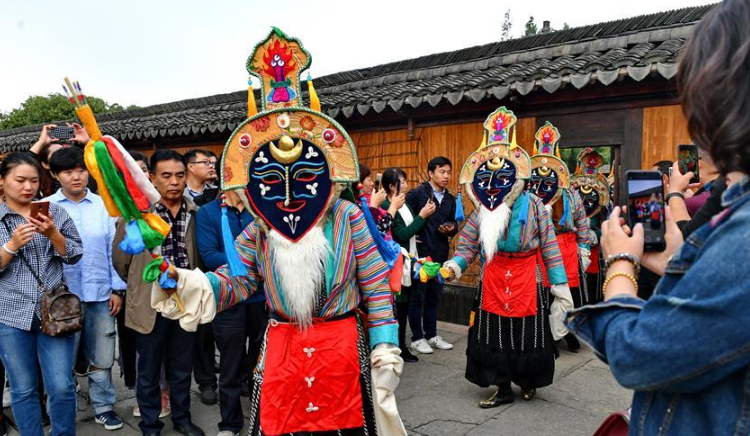 頭戴“藍”面具、身著五彩裝……附耳在一鼓一鈸中,且看這18名雪域農(nóng)牧民,在這江南水鄉(xiāng)的柔情中吟唱而舞。