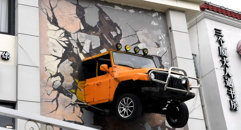 2018年11月13日,在廈門市區(qū)環(huán)島路上,一輛裝飾在建筑墻面上的汽車,結(jié)合3D圖案讓人感覺汽車“破”墻而出,創(chuàng)意十足。