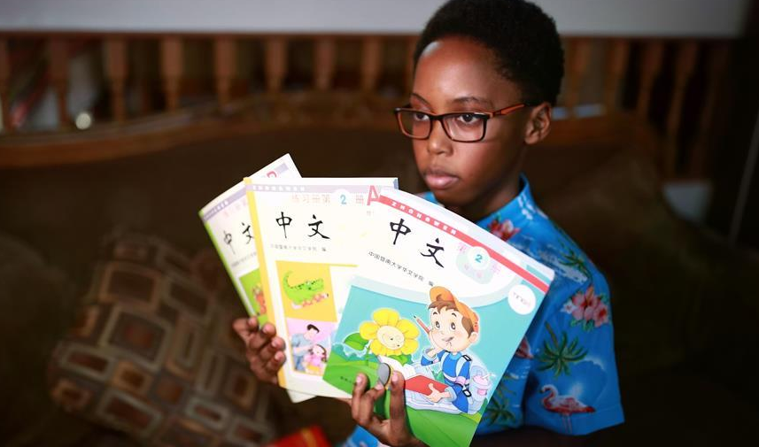 9月25日,在美國芝加哥,卡亞·恩朱比展示漢語課本。新華社記者 汪平 攝 9月25日,在美國芝加哥,卡亞·恩朱比接受新華社記者采訪。