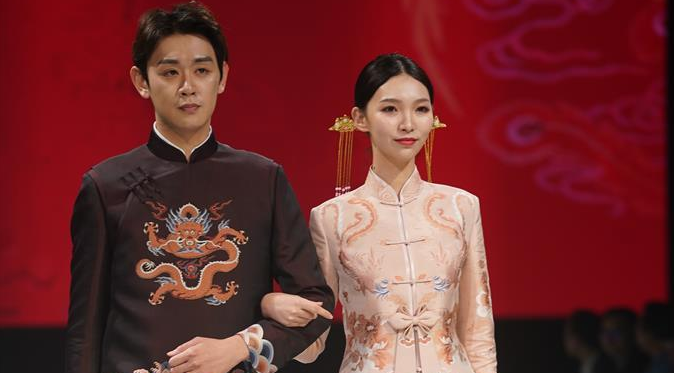 主題秀上展示大量帶有龍鳳、牡丹、海棠、彩蝶等中國傳統(tǒng)文化元素的宋錦中式婚慶禮服。