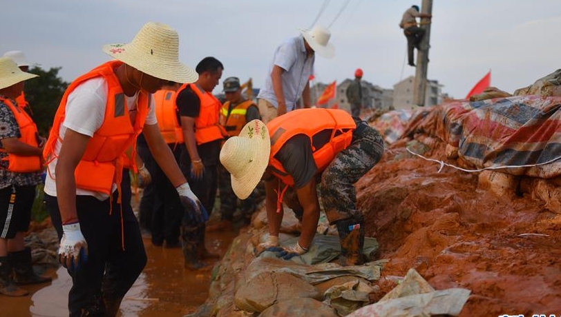 在江西鄱陽縣昌江圩,武警江西總隊機動支隊的工作人員和當地村民一起扛沙袋加固圩堤.