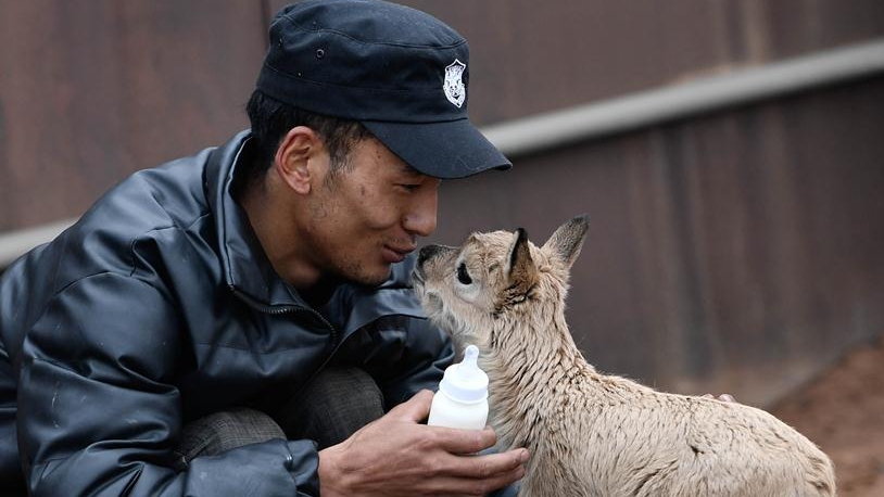 7月7日,三江源國家公園管理局長江源園區(qū)可可西里管理處卓乃湖保護站的工作人員才文多杰在給藏羚羊幼仔喂奶。