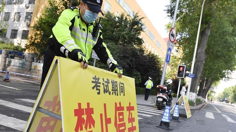 7月7日,在吉林省長(zhǎng)春市的東北師范大學(xué)附屬中學(xué)考點(diǎn)外,執(zhí)勤交警在道路上架設(shè)提示牌。
