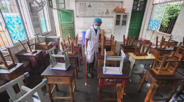 6月8日,永州市江華瑤族自治縣白芒營鎮(zhèn)車下完全小學(xué)開展清淤、消毒工作,為6月9日恢復(fù)上課做準(zhǔn)備。