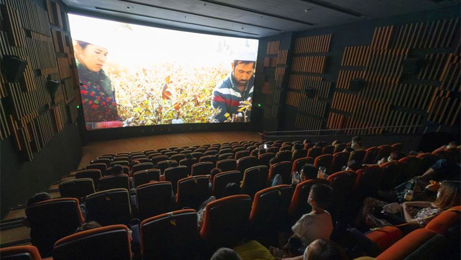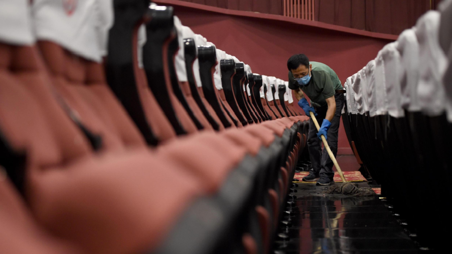 2020年7月23日,位于北京前門大柵欄的大觀樓影院的工作人員在影廳內(nèi)進行復(fù)映前的清掃工作。