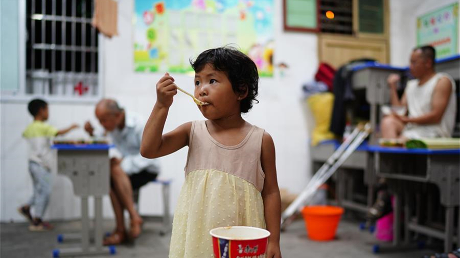 7月23日,在廬山市蛟塘鎮(zhèn)中心小學(xué)安置點,小朋友在美術(shù)課上繪畫。