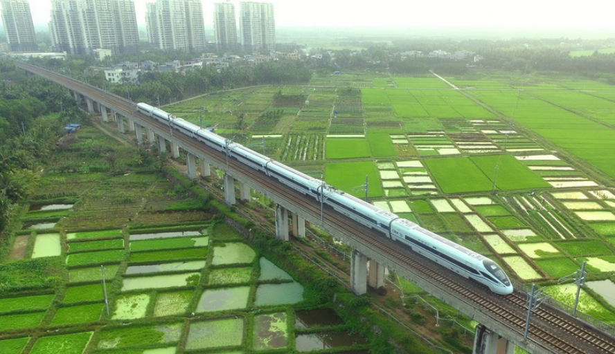 2020年3月17日,海南環(huán)島鐵路一列動(dòng)車(chē)從春光明媚的瓊海城區(qū)經(jīng)過(guò)。