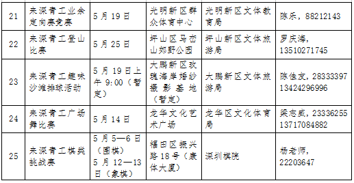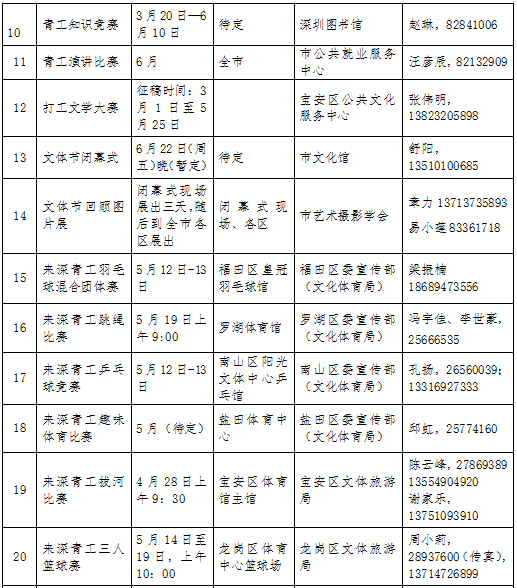 活動(dòng)期間,全市將舉辦25項(xiàng)全市性重要活動(dòng),分為6項(xiàng)活動(dòng),19項(xiàng)比賽。其中,6項(xiàng)活動(dòng)為開幕式、“行走鵬城 感受深圳”惠民活動(dòng)、全市勞務(wù)工讀書成才巡回報(bào)告會(huì)、來深青工文體節(jié)回顧圖片展、閉幕式及優(yōu)秀獲獎(jiǎng)節(jié)目展演;19項(xiàng)比賽活動(dòng)分別是來深青工歌手大賽(全國)、才藝大賽、攝影大賽(全國)、美術(shù)大賽、書法大賽、知識(shí)競賽、演講比賽、打工文學(xué)大賽(全國)、羽毛球混合團(tuán)體賽、跳繩比賽、乒乓球競賽、趣味體育比賽、拔河比賽、三人籃球賽、業(yè)余定向賽競賽、登山比賽、棋類挑戰(zhàn)賽、趣味沙灘排球比賽、廣場健身操比賽。參賽對(duì)象主要為在深工作的18至50歲非深戶籍人士(不包括在各類文化演藝公司、培訓(xùn)機(jī)構(gòu)中從事文藝表演、培訓(xùn)的專業(yè)人員)。