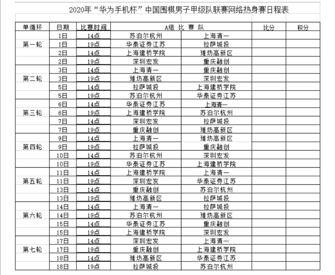 附2:2020年“華為手機杯”中國圍棋男子甲級隊聯(lián)賽網(wǎng)絡(luò)熱身賽AB兩組日程表