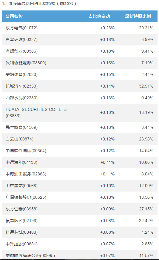 在最近5個交易日內,晨鳴紙業(yè)(01812)、長城汽車(02333)、山東新華製藥股份(00719)港股通持股占比增加值最大,分別增加5.17%、0.82%、0.62%;金蝶國際(00268)、金山軟件(03888)、阜豐集團(00546)港股通持股占比減少值最大,分別減少-1.26%、-1.25%、-0.86%。
