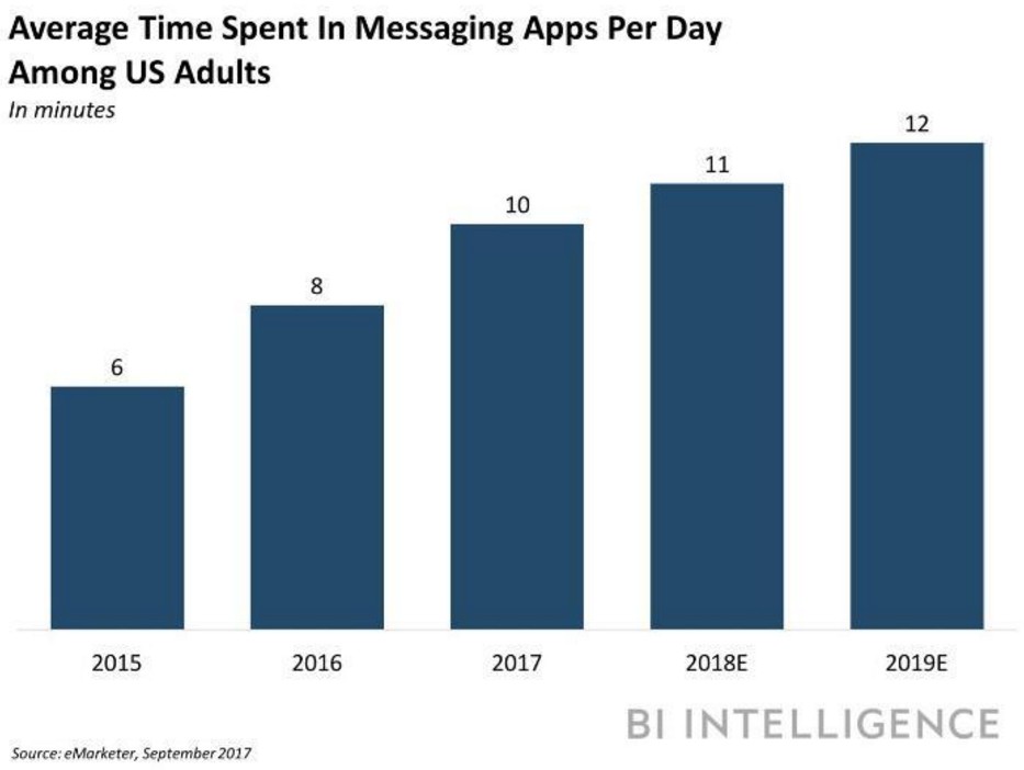 據(jù)市場研究公司eMarketer的統(tǒng)計數(shù)據(jù)顯示,去年,美國消費者平均每天在一款通訊應用上逗留的時間是10分鐘,較2016年的8分鐘增長了15.2%。這個平均逗留時間在今年有望增長到11分鐘,在2019年有望增長到12分鐘。