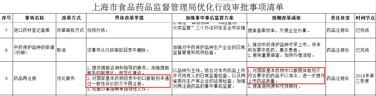 在清單“藥品再注冊(cè)”事項(xiàng)中,明確“加強(qiáng)對(duì)再注冊(cè)藥品的事中事后監(jiān)管”“對(duì)國(guó)家基本藥物目錄中口服制劑未通過一致性評(píng)價(jià)的不予再注冊(cè)”“對(duì)國(guó)家基本藥物中口服固體制劑不符合要求的藥品予以淘汰”。