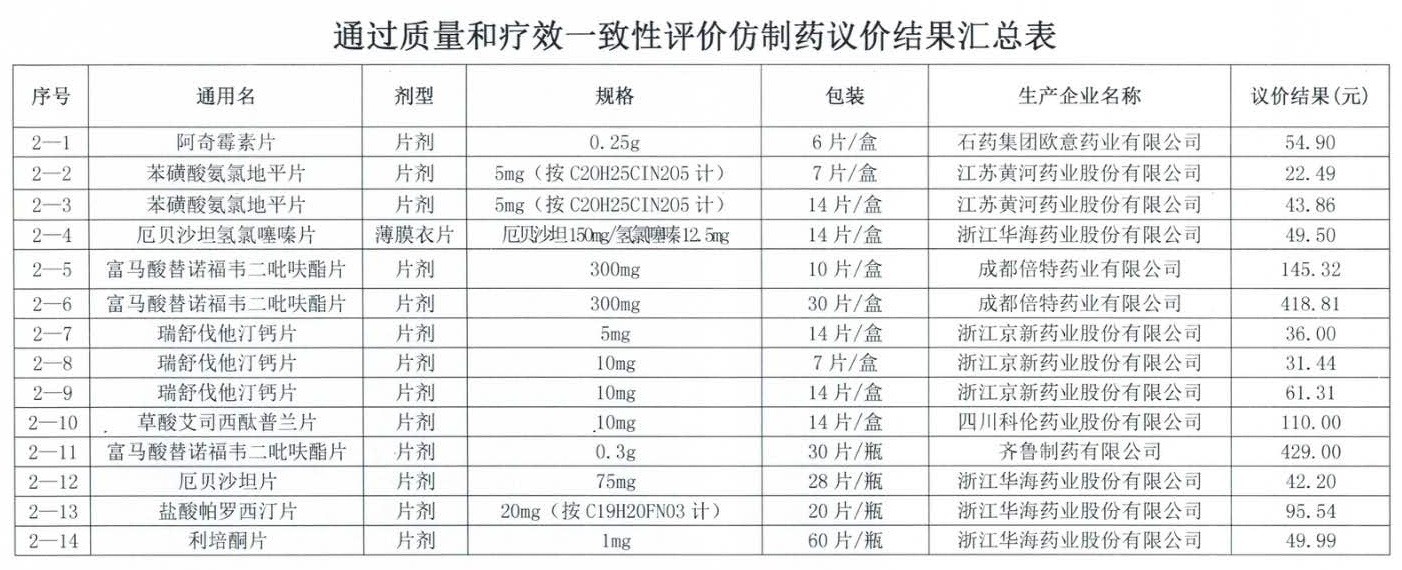 在議價(jià)的品種中,通過一致性評(píng)價(jià)全部議價(jià)成功的14個(gè)藥品包括石藥(01093)歐意的阿奇霉素片、江蘇黃河的苯磺酸氨氯地平片、浙江華海的厄貝沙坦片、京新藥業(yè)的瑞舒伐他汀鈣片、科倫藥業(yè)的草酸艾司西酞普蘭片、成都倍特和齊魯制藥的富馬酸替諾福韋二吡呋酯片等。