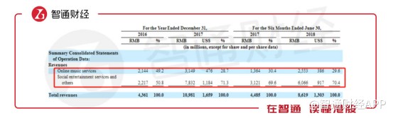 可以看到,2017年上半年,公司在線音樂服務與以音樂為核心的社交娛樂服務分別占到總收入的28.7%和71.3%,而在2018年上半年,這兩個數(shù)值為29.6%和70.4%。也就是說,社交娛樂服務為騰訊音樂的“核心業(yè)務”。