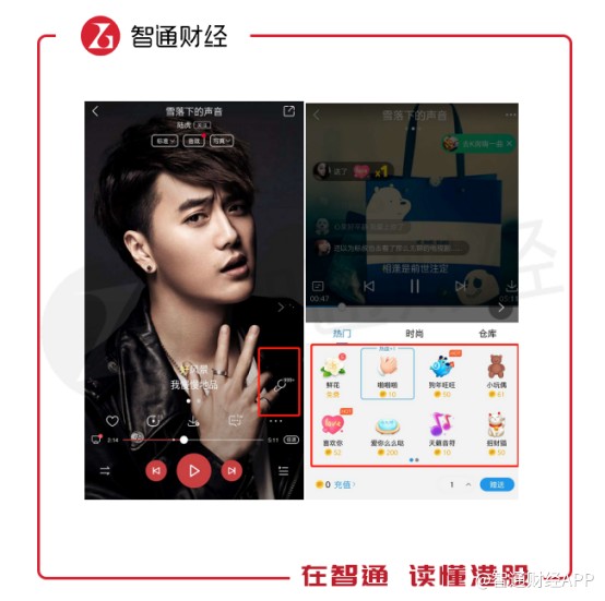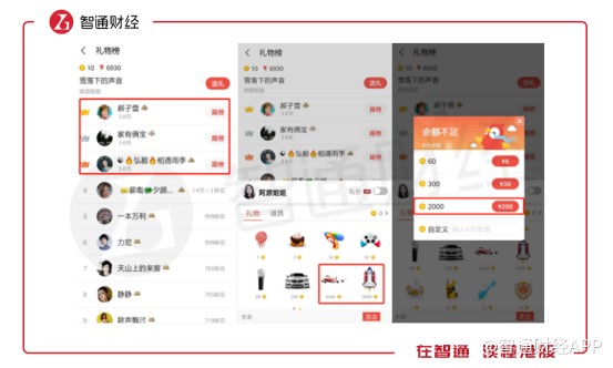 在用戶進入K歌界面后,除了K歌按鍵還有就是歌曲榜單,這些榜單記錄的是該歌曲翻唱獲得禮物數(shù)的排行情況。翻唱歌手被打賞的禮物越多,榜單排名越高,禮物則是靠用戶通過現(xiàn)金兌換而來。與直播打賞類似,全民K歌也是通過用戶購買虛擬禮物進行變現(xiàn)。