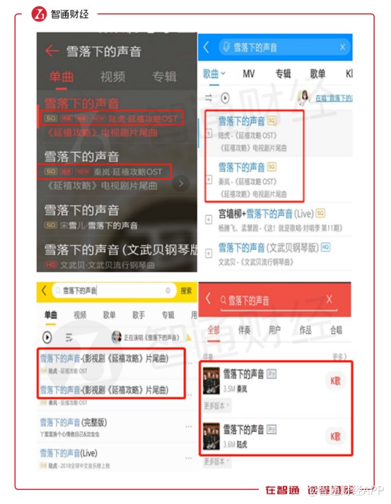 以此前熱播劇《延禧攻略》的片尾曲《雪落下的聲音》為例。這首歌的版權(quán)由QQ音樂獨家擁有,并在APP中擁有“獨家”的標識。但實際上,該歌曲在酷狗音樂、酷我音樂和全民K歌上同樣可以播放,可以說騰訊音樂版權(quán)在公司旗下4個產(chǎn)品是通用的。