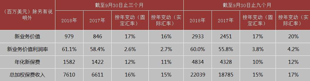11月9日,友邦保險控股有限公司(1299)公布截至2018年9月30日止第三財季業(yè)績顯示,報告期內(nèi),按固定匯率計算,公司新業(yè)務(wù)價值增長17%至9.79億美元,年化新保費上升12%至15.82億美元,新業(yè)務(wù)價值利潤率增加2.6個百分點至61.1%,總加權(quán)保費收入上升16%至76.10億美元。