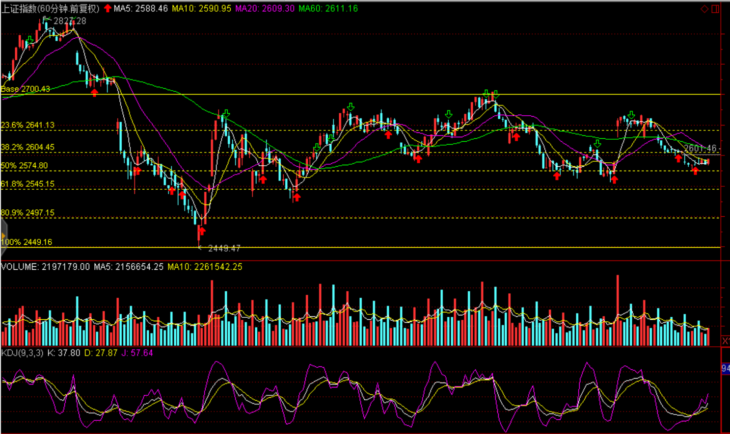 技術(shù)面:短期企穩(wěn)回升,弱勢反彈,60分鐘黃金分割線滬綜指2604點、2641點、創(chuàng)業(yè)板1360點一線存在壓力。