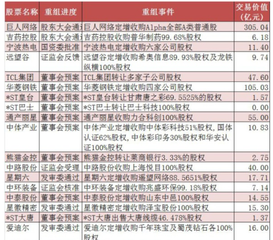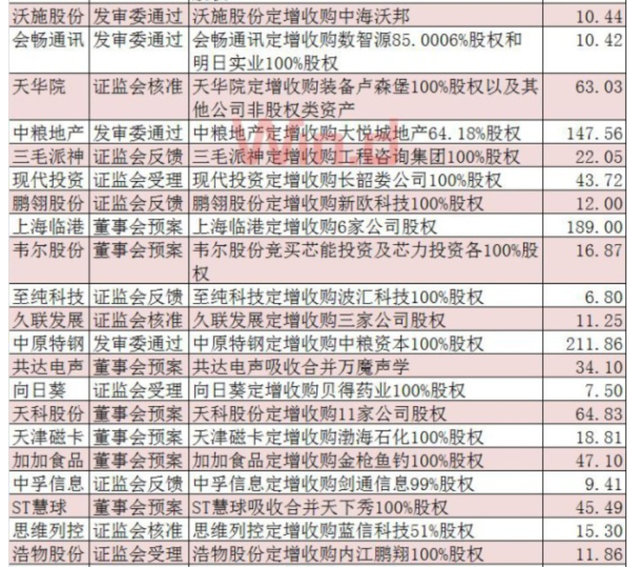 并購重組經(jīng)歷近二年的低谷后,政策由緊到松,目前快速回暖,概念股逐步走強,近日又有多家公司公布并購方案;