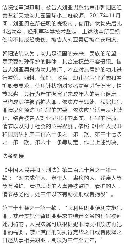 智通財經(jīng)APP獲悉,12月26日上午,北京市朝陽區(qū)人民法院依法對被告人劉亞男(紅黃藍幼兒園教師)虐待被看護人案公開宣判,以虐待被看護人罪一審判處劉亞男有期徒刑一年六個月,同時禁止其自刑罰執(zhí)行完畢之日或者假釋之日起五年內(nèi)從事未成年人看護教育工作。(肖順蘭)