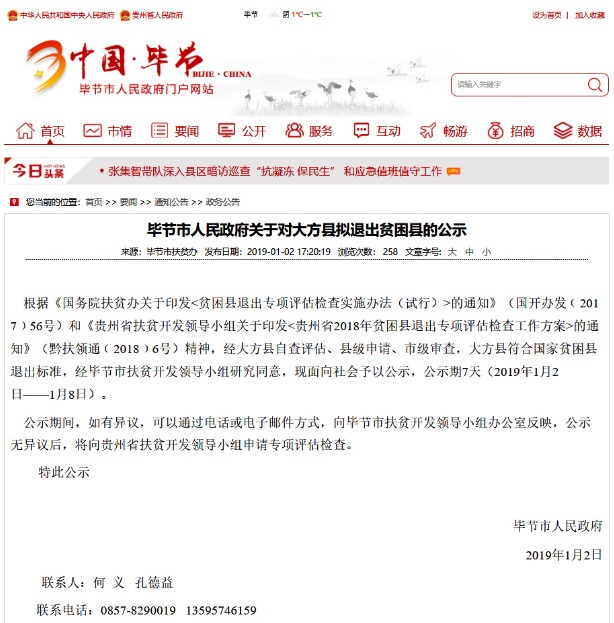 畢節(jié)市人民政府關于對大方縣擬退出貧困縣的公示