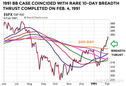 上述布林通道技術(shù)形態(tài)屬較為罕見(jiàn)的類型。值得注意的是,1954年和1991年時(shí)的另一技術(shù)指標(biāo),廣量沖力指標(biāo),基本上與2019年1月21日出現(xiàn)的廣量沖力指標(biāo)形態(tài)類似。因此,在1954年、1991年和2019年,標(biāo)普500指數(shù)走出了布林通道及廣量沖力指標(biāo)都相似的技術(shù)形態(tài)。