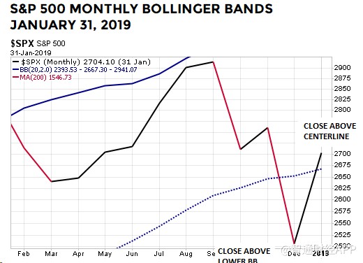 下圖顯示了標(biāo)普500指數(shù)1月31日收于布林通道月線中軌上方。標(biāo)普500指數(shù)在12月收于中軌以下,但在1月份便開始反彈,并成功回到中軌以上: