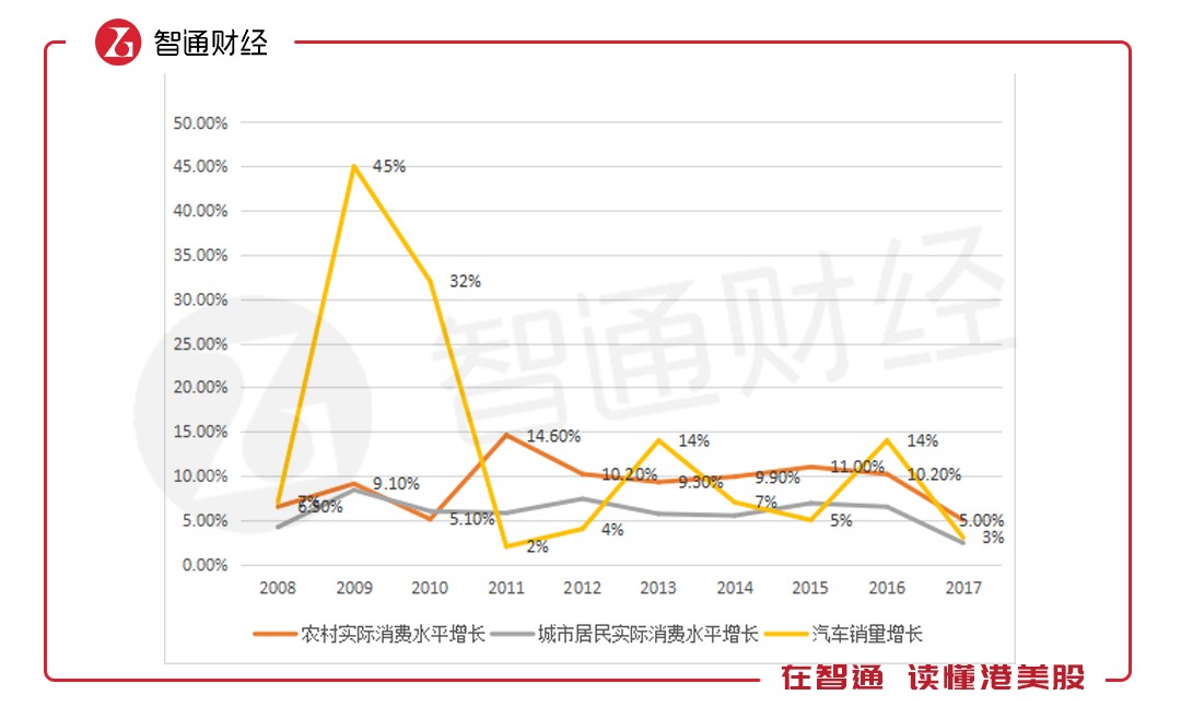 以上數(shù)據(jù)說明,農(nóng)村市場并不樂觀,一方面是實際的購買力弱,遠低于2007年的城市消費水平,一方面農(nóng)村及城市消費水平增長均下滑,若經(jīng)濟增長壓力持續(xù)存在,未來可能錄得負增長,汽車銷量將難以反彈。