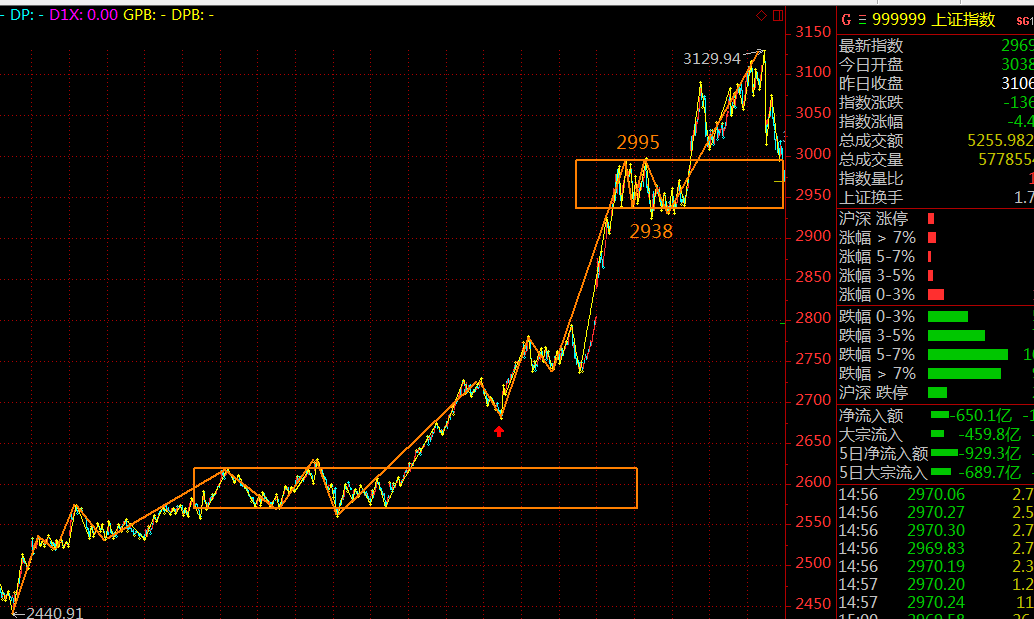 可以很明顯的看出,這是一波五分鐘級別的雙中樞上漲,這波上漲隨著周五尾盤跌入2995點結(jié)束。市場在后續(xù)的演化過程中會做出選擇:開始五分鐘級別下跌趨勢,或者圍繞著五分鐘上漲趨勢的最后一個中樞進(jìn)行行情級別擴(kuò)張。不論哪種情況,從纏論的視角,短期這輪上漲趨勢暫告一段落,3129.94點即是五分鐘趨勢的第一類賣點,在下周,市場企穩(wěn)后,大概率會上沖構(gòu)建第二類賣點。