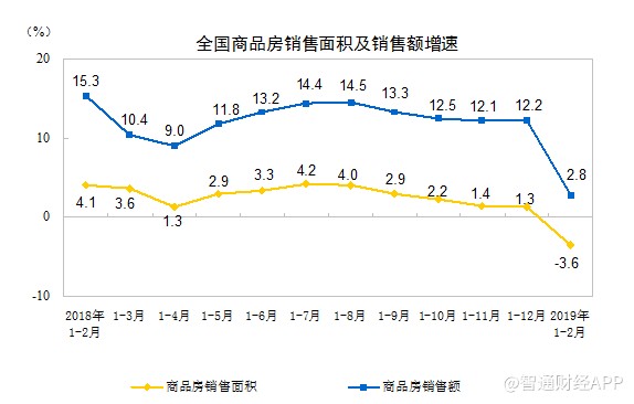 1-2月份,商品房銷(xiāo)售面積14102萬(wàn)平方米,同比下降3.6%,2018年全年為增長(zhǎng)1.3%。其中,住宅銷(xiāo)售面積下降3.2%,辦公樓銷(xiāo)售面積下降15.7%,商業(yè)營(yíng)業(yè)用房銷(xiāo)售面積下降13.6%。商品房銷(xiāo)售額12803億元,增長(zhǎng)2.8%,增速回落9.4個(gè)百分點(diǎn)。其中,住宅銷(xiāo)售額增長(zhǎng)4.5%,辦公樓銷(xiāo)售額下降6.2%,商業(yè)營(yíng)業(yè)用房銷(xiāo)售額下降9.4%。