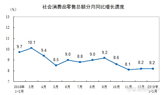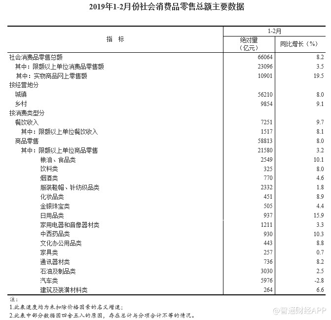 智通財經(jīng)APP獲悉,國家統(tǒng)計局公布,2019年1-2月份,社會消費品零售總額66064億元,同比名義增長8.2%,符合預期,但低于前值增長9%。其中,限額以上單位消費品零售額23096億元,增長3.5%。