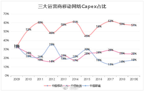 過去十年,中國移動(dòng)占比三大運(yùn)營商總資本開支的范圍基本處于50%-60%區(qū)間,電信占比20-30%,聯(lián)通15%-30%。