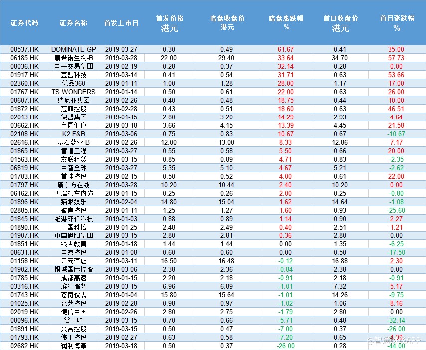 另外,截至一季度底,36只新股中,共有14只股失守發(fā)行價(jià),破發(fā)率為39%。值得的注意的是,相比于2018年港股新股70%的破發(fā)率,2019年一季度的破發(fā)率有明顯的下降。其中,天瑞汽車內(nèi)飾以42.36%,成為一季度市場(chǎng)表現(xiàn)最差新股。而嘉藝控股則以196.23%的漲幅,成為一季度市場(chǎng)表現(xiàn)最牛新股。(陳嘉林)