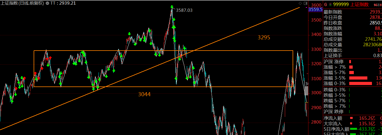 上證指數(shù)日K線看,缺口跌破了日K中樞的下軌,這里會對反彈產(chǎn)生較大壓力,關(guān)注3044點(diǎn)的反壓。