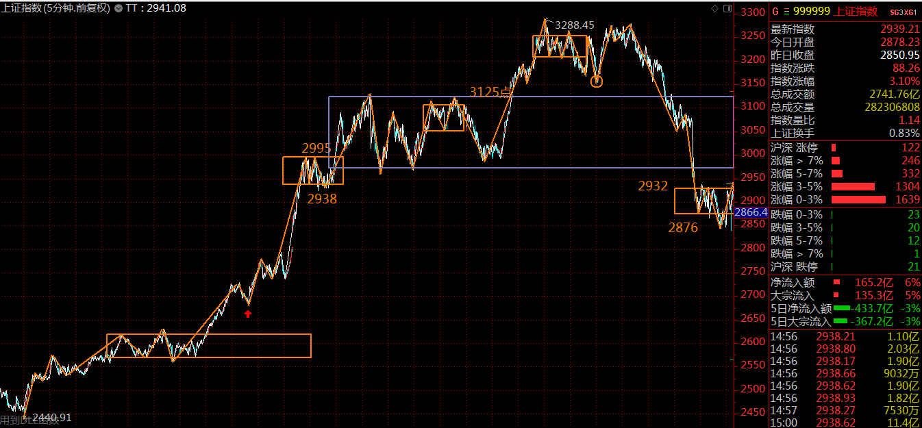 再看5分鐘級別走勢結(jié)構(gòu),在特朗普的幫助下,這里直接跌穿了三月份構(gòu)建的三十分鐘級別中樞,力度較大。周五逆轉(zhuǎn)趨勢后,在三十分鐘中樞下面,完成了這段下跌趨勢第二個(gè)五分鐘中樞的構(gòu)建工作。大概率宣告了這段五分鐘下跌趨勢的終結(jié)。下周一、周二,上證指數(shù)面臨了上方30分鐘中樞下軌2968點(diǎn)的反壓,可能會出現(xiàn)回落,投資者可逢低吸納。