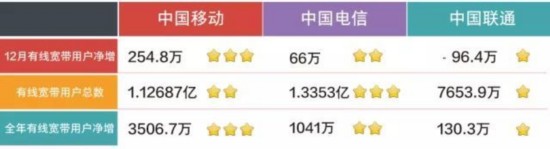 中國移動的12月、全年有線寬帶用戶凈增數(shù)均超過電信聯(lián)通總和的兩倍。中國移動在固網(wǎng)業(yè)務上采取超低價策略,但用戶總數(shù)仍與中國電信相差2000多萬,增速較前幾月也有所放緩,這也說明固網(wǎng)寬帶業(yè)務已經(jīng)觸到了天花板,發(fā)展新用戶越來越難。