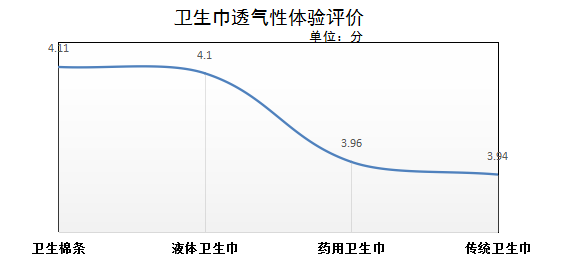 在本次主觀體驗(yàn)透氣性方面,衛(wèi)生棉條評價最高,平均得分4.11分;其次是液體材料衛(wèi)生巾,平均得分4.1分;藥用衛(wèi)生巾和傳統(tǒng)型衛(wèi)生巾透氣性評價稍遜,平均得分分別為3.96和3.94分。