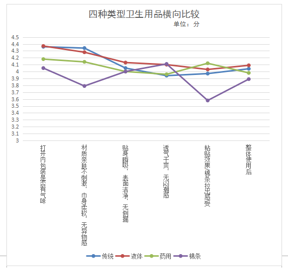 本次衛(wèi)生巾比較試驗(yàn)共招募150名目前沒有從事有關(guān)衛(wèi)生巾行業(yè)的年齡介于16-45歲之間的消費(fèi)者分別對傳統(tǒng)型衛(wèi)生巾、新型衛(wèi)生巾(液體材料衛(wèi)生巾)、衛(wèi)生棉條、功能性(藥用)衛(wèi)生巾四種類型商品進(jìn)行體驗(yàn)。要求體驗(yàn)消費(fèi)者對所使用的衛(wèi)生用品進(jìn)行1-5分的評價(1分最低,5分最高),主要體驗(yàn)內(nèi)容及感受如下:
