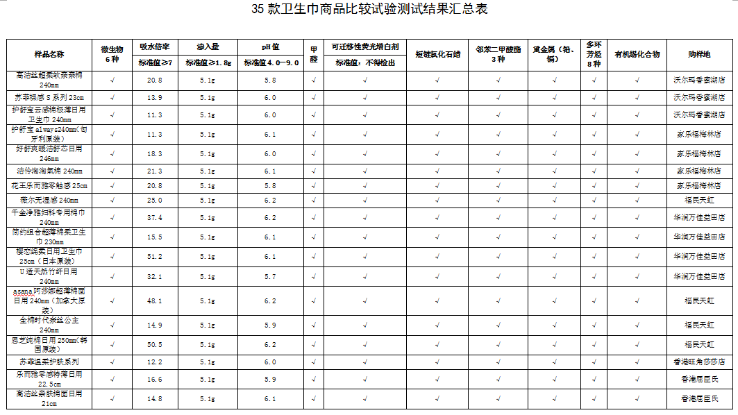試驗(yàn)結(jié)果表明參與比較試驗(yàn)的35款衛(wèi)生巾產(chǎn)品,從安全指標(biāo)方面來看未檢測出超標(biāo)問題;使用性能指標(biāo)方面也均達(dá)到測試標(biāo)準(zhǔn),女性消費(fèi)者可放心選購。